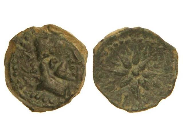 Sextante. MALACA. Anv.: Cabeza de Vulcano con gorro puntiagudo, filateado con puntos a derecha, detrás leyenda neopúnica. Rev.: Estrella de dieciséis rayos. 2,60 grs. Variante del G.G.-83 por cabeza de mayor tamaño. Pátina verde oscura. AB-1
