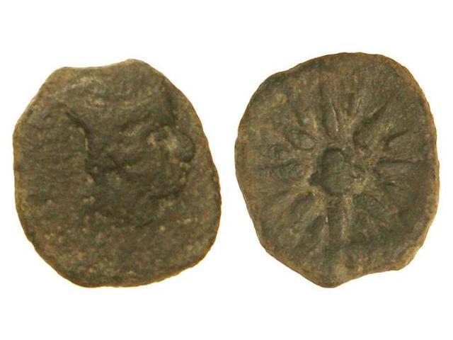 Sextante. MALACA. Anv.: Cabeza masculina con gorro puntiagudo a derecha. Rev.: Estrella de dieciséis rayos cuyo glóbulo es una cabeza de frente. 1,40 grs. Pátina oscura. AB-No cat.; G.G.-91 mismo ejemplar. MBC-/MBC.