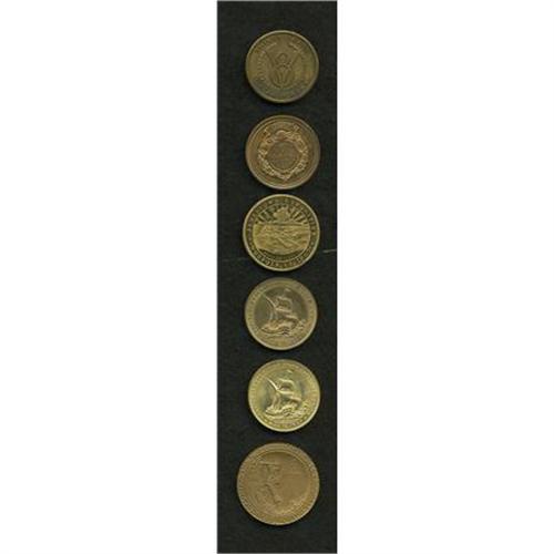 <B>Sextet of So-Called Dollars.</B></I> Includes: <B>HK-347,</B></I> <B>1907 Jamestown Tercentennial Exposition </B></I>in gilt (two pieces); <B>HK-349,</B></I> <B>1907 Jamestown Tercentennial Exposition, Battleship </B></I><B><I>Virginia </B></I></B></I>dollar; <B>HK-463, 1933 Century of Progress, Chicago's World Fair; HK-464a,</B></I> <B>1933 Century of Progress, Chicago's World Fair, Cheerio Cow </B></I>dollar; and <B>HK-465, 1933 Century of Progress, Ford V-8</B></I> dollar.<BR><BR><b>Shipping:</b> Coins & Currency (<a target="_blank" href="http://www.heritageauctions.com/common/shipping.php">view shipping information</a>)
