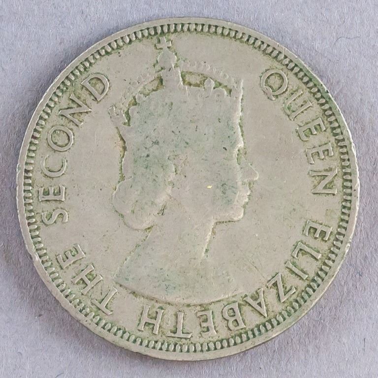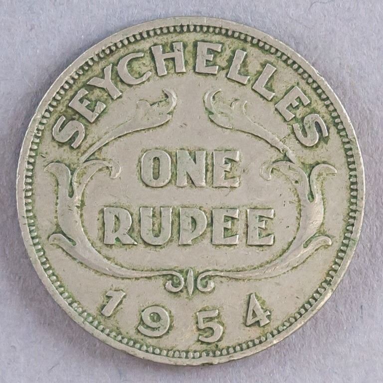 Seychelles coin. Obverse: Crowned head right. Lettering: QUEEN ELIZABETH THE SECOND. Reverse: Value within sprig above date. Lettering: SEYCHELLES / ONE RUPEE / 1974.
