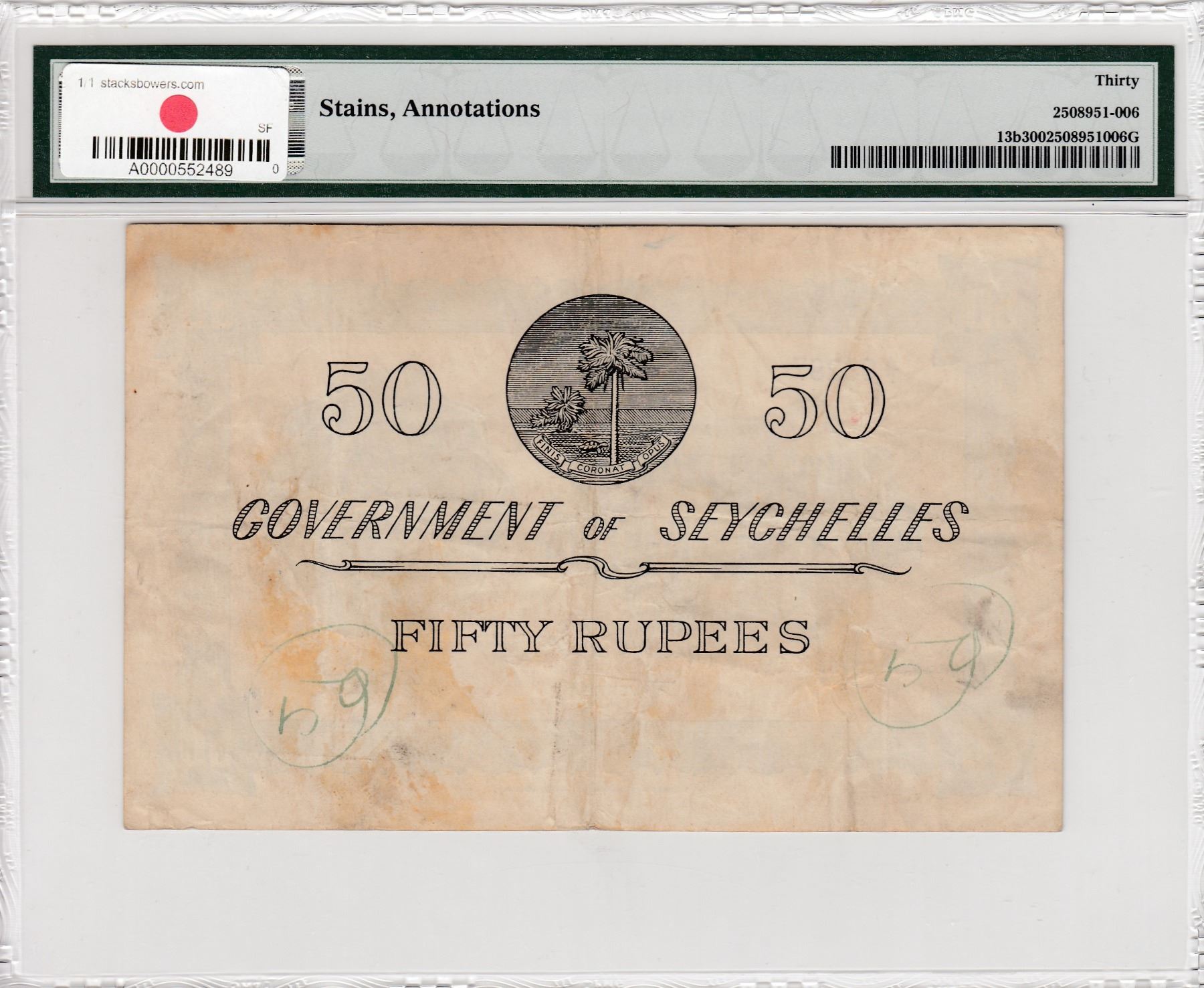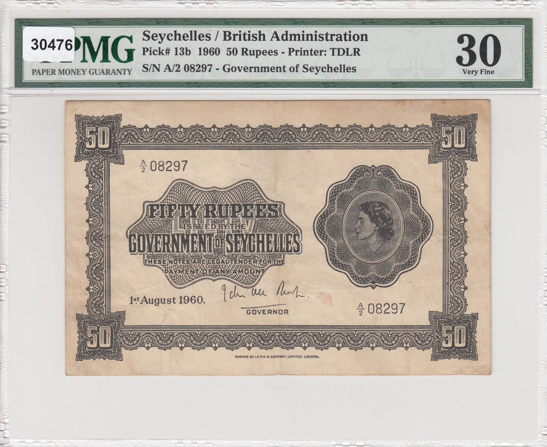 Seychelles, 50 Rupees, 1960, VF, p13bbr/PMG 30, Queen Elizabeth II portrait, serial number: A/2 08297