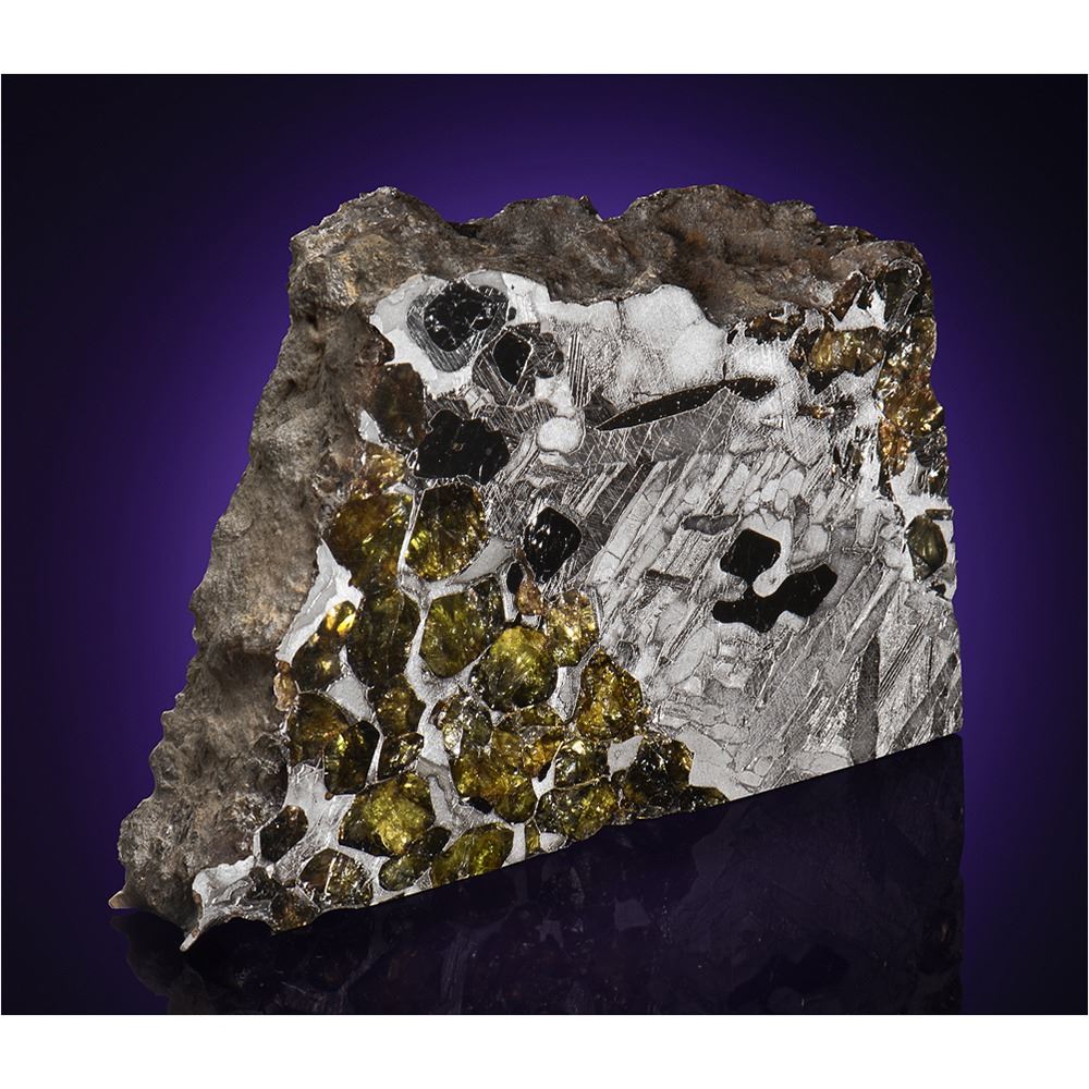 Representing less than 0.2% of all known meteorites, pallasites are the most beautiful extraterrestrial substance known. Like all pallasites, Seymchan formed at the boundary of the stony mantle and molten iron core of an asteroid that was obliterated following a collision with another asteroid. The crystals of olivine and peridot (gem-quality olivine and the birthstone of August) are the result of chunks of the stony mantle becoming encircled by the metal of the asteroid’s metallic core. The materials then cooled and crystallized. The prominent metallic latticework seen is referred to as a Widmanstätten pattern. It is evidence of a slow cooling rate that provided sufficient time — millions of years — for two metallic alloys to orient into their crystalline structure.