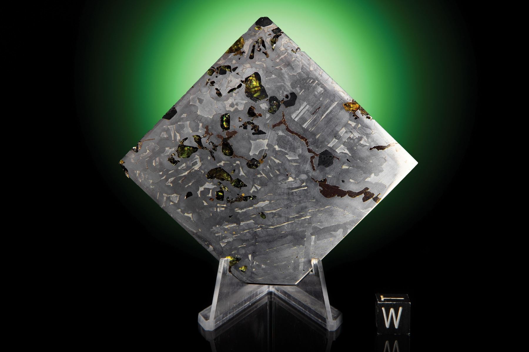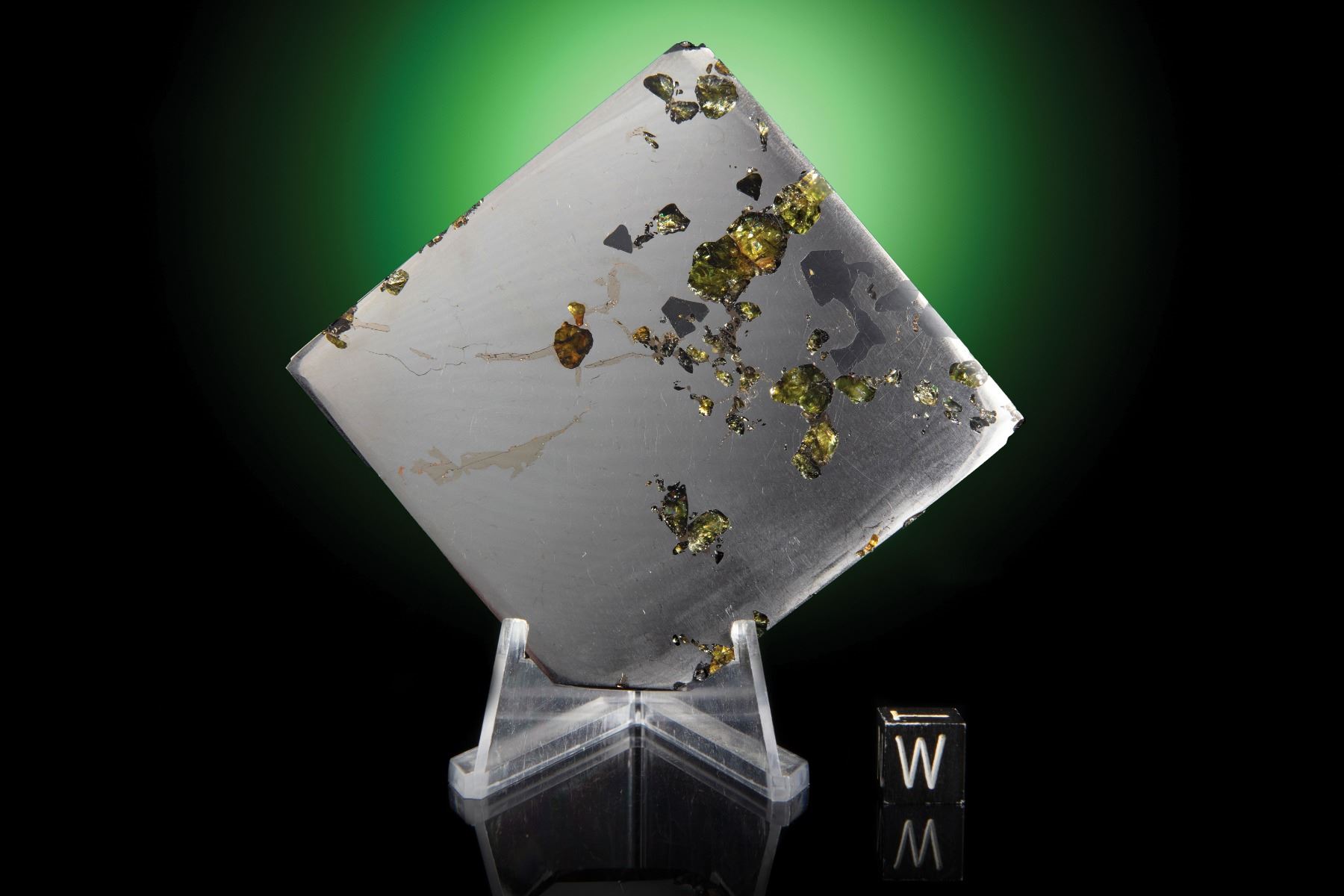 Seymchan has an unusual structure: some areas display olivine-rich clusters, while others consist almost entirely of nickel-iron. During its tumultuous flight through the atmosphere and subsequent impact, it is easy to imagine the meteoritic masses of Seymchan shearing at the nickel-iron/olivine borders. Some pieces, therefore, appear to be entirely metallic, while others appear pallasitic. This explains why Mednikov found what he assumed to be an entirely iron, or sideritic meteorite, while later expeditions found what they assumed to be pallasites. Similar instances of pallasite meteorites from the same fall exhibiting different features from one mass to another have been seen in the Brenham, Kansas meteorite [SEE LOT 2449]. This square-cut part slice is polished on one side and etched with nitol on the other, to reveal its shimmering Widmanstätten Pattern. Small, luminous, richly-colored olivine (peridot) crystals are suspended in a shiny nickel-iron matrix.