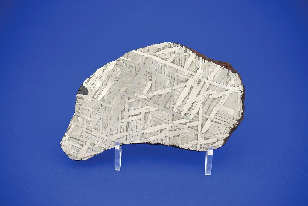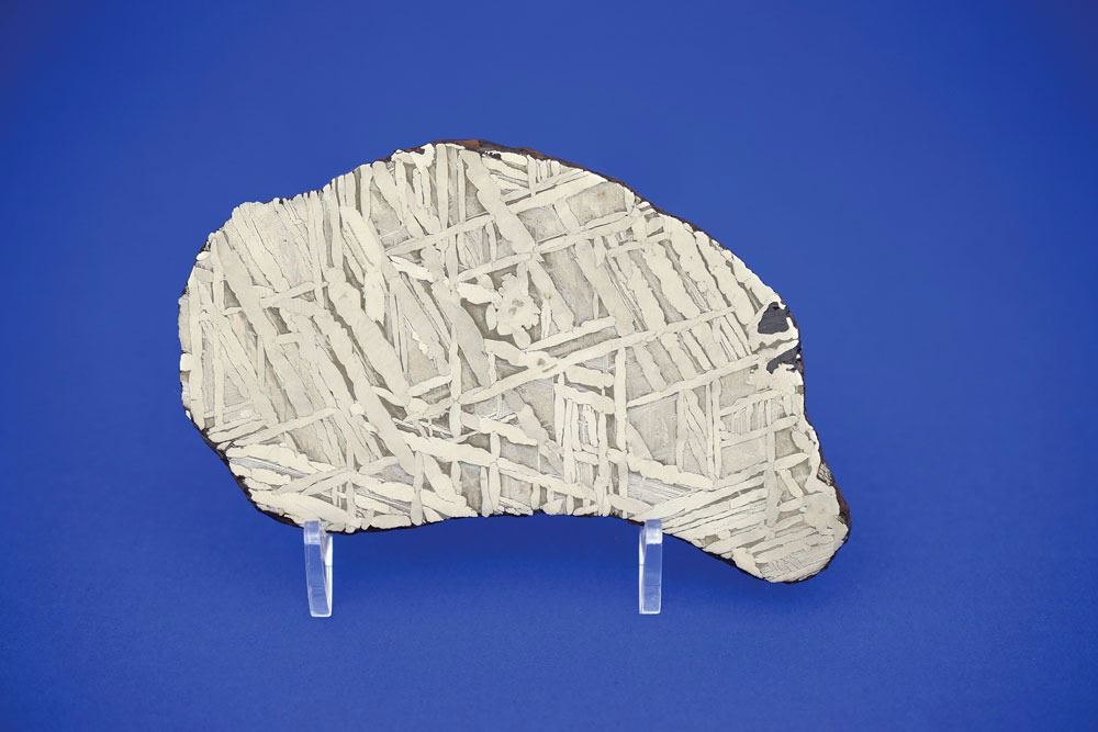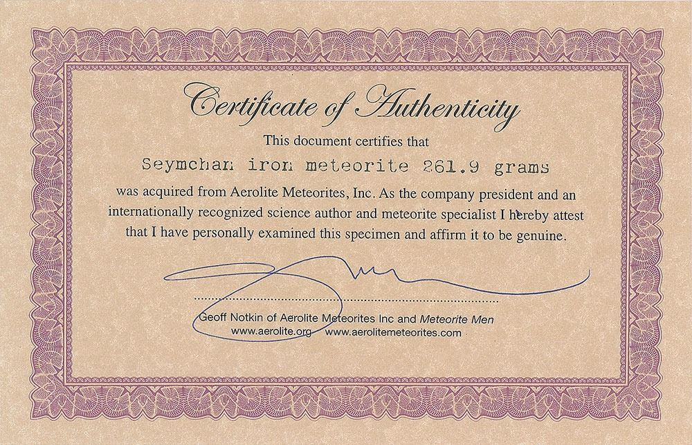 Seymchan pallasite siderite meteorite (Russia) slice, beautifully etched on both faces to reveal a complex lattice-like Widmanstatten pattern. The full etched slice weighs 261.9 grams and measures approximately 137 mm x 86 mm x 4 mm. In fine condition. Accompanied by a certificate of authenticity signed by Geoff Notkin of Aerolite Meteorites Inc. and the TV show Meteorite Men. While Seymchan is officially classified as a pallasite meteorite (comprised of an iron and olivine mixture), this piece shows only iron and is thus described as a siderite specimen. This example features an especially appealing shape and etch pattern.