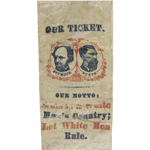 <B>Seymour & Blair: An Extremely Rare Jugate Ribbon from Their 1868 Candidacy.</B></I> By 1868 regional political allegiances had formed which would prevail for decades. The Republicans were at that time considered the more "liberal" party, favoring Reconstruction and expanded opportunities for African Americans. The northern Democrats, many of whom had only reluctantly supported the Union cause in the late war, aligned with southern Democrats. Voters in the former Confederate states formed the legendary "Solid South." As soon as federal troops ended Reconstruction by their withdrawal in the late 1870s, southern states would be inhospitable to Republican candidates for nearly a century. Among the tenets of the Democratic party of that era was a general hostility to African Americans, particularly to their active role in electoral politics. <BR><BR>The present ribbon embodies the mood of the time with the slogan "Our motto: This Is A White Man's Country, Let White Men Rule". Only a handful of Seymour & Blair jugate ribbons of any design have survived, and this one is particularly favored by collectors for its bright red, white, and blue coloration and significant slogan. The last example we offered for sale appeared as lot 25441 in our June 7th 2006 American auction. Even with light soiling and "aging" it drew aggressive bidding, and sold well above estimate at $8,365. <BR><BR>The present example would have a roughly comparable appearance, but for various small separations, which required that the ribbon be professionally re-backed to stabilize it. The separations are concentrated in the lower portion, affecting several words in the slogan, as the photo shows. Nonetheless, a very display worthy example of this important jugate ribbon. Dimensions: 2.5" x 5". <BR><BR><b>Shipping:</b> Flat Material, Small (<a target="_blank" href="http://www.heritageauctions.com/common/shipping.php">view shipping information</a>)
