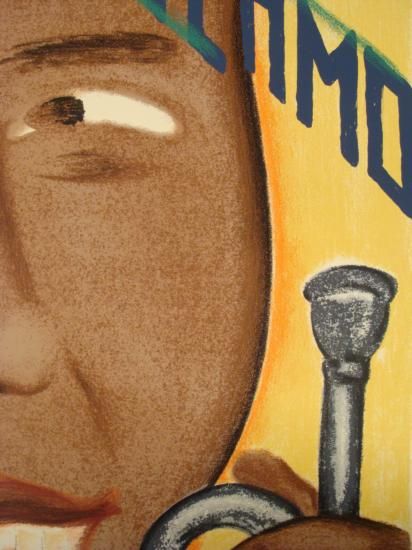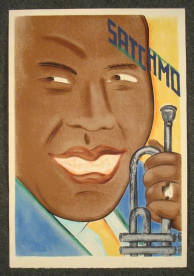 This is a large print of jazz signer and trumpet legend Louis Armstrong by artist Seymour Chwast. "Satchmo's" charismatic personality shines through in this composition, with close-up on his bold grin, and trumpet. Artist: Seymour Chwast Title: "Satchmo" Series: The "O" Series (in which every subject's name ends in the letter "o.") Sheet size: Each 30 x 43 inches Signature: Signed by the artist, in pencil, lower right Edition: Numbered from an edition of 200 in pencil, lower left Condition: Excellent Certificate of Authenticity: IncludedThis print brings Satchmo into a larger than life presence, with stylish, jazzy design. Biography: * Seymour Chwast was born in New York, and studied illustration and graphic design at The Cooper Union. Paul Klee and Georges Rouault were some of his formative influences. The style he developed, with thick bold outlines, had a visual impact on the world contemporary art, design, and advertising. He founded Push Pin Studios to bring a new vitality to graphic design, with an emphasis on hand drawn illustration. His art found its way into posters, packaging, record-sleeves, magazines and children's books. His work has been exhibited in many fine institutions. Chwast and his studio were honored at the Louvre in Paris in a retrospective exhibition. His posters are in the permanent collection of New York s Museum of Modern Art, The Cooper-Hewitt Museum of The Smithsonian Institution, and The Library of Congress. *