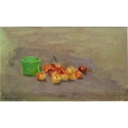 Seymour Remenick, "Cherries with Green Glass", oil on paper, signed (L.L.), framed, image measures 5 3/4" x 9 1/4"