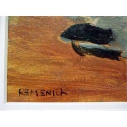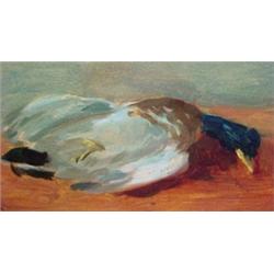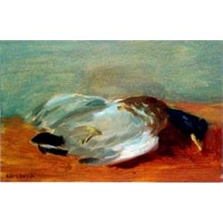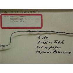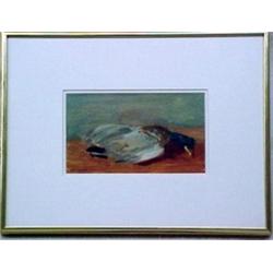 Seymour Reminick, "Duck on Table", signed (L.L.), oil on paper, listed American, framed, image measures 4 1/4" x 7"