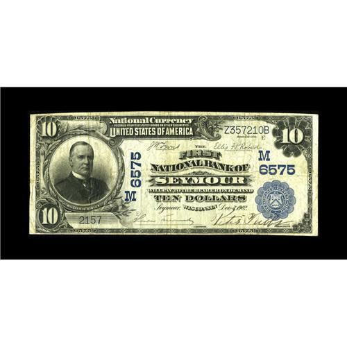 <B>Seymour, WI</B></I> - $10 1902 Plain Back Fr. 624 <B>The First NB</B></I> Ch. # (M)6575<BR>Nice pen signatures are displayed by this $10 from Outgamie County. The last time a similar note from this scarce bank crossed the auction block it brought nearly $1000. That was less than two years ago. <B>Fine.</B></I><BR><BR><b>Shipping:</b> Coin/Currency (<a target="_blank" href="http://www.heritageauctions.com/common/shipping.php">view shipping information</a>)