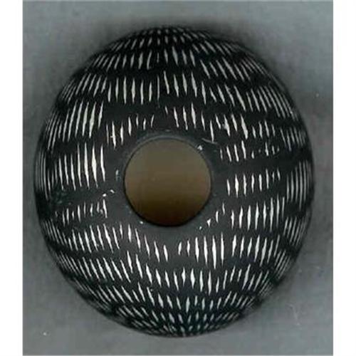 Not signed. Ball shaped small vase. Matte black with incised quill like decoration.