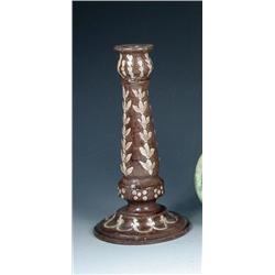 'Sgraffito', a mauve brown candlestick, the nozzle and gun barrel column scratched and white slip decorated with vertical bands of leaves, incised and sprig marks, 21.5cm high (D) £20-30
