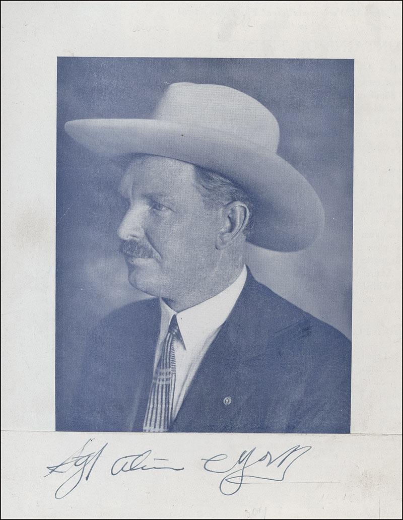 American World War I hero (1887–1964) who won the Medal of Honor for leading a successful charge on a German machine-gun nest that resulted in 32 German deaths and the capture of 132 prisoners. Vintage ink signature, “Sgt. Alvin C. York,” on an off-white 5.25 x 1 slip, affixed to the bottom of a 5.5 x 7 clipped magazine photo of York. Some scattered light soiling and small pencil notations to slip, and some light rippling to photo, otherwise fine condition.