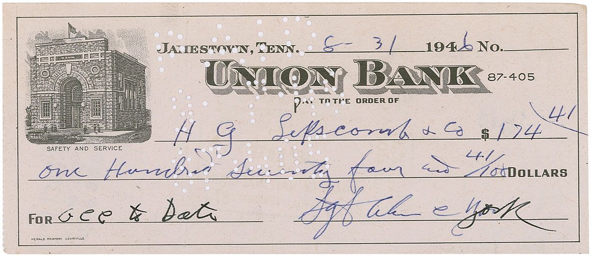 American World War I hero (1887–1964) who won the Medal of Honor for leading a successful charge on a German machine-gun nest that resulted in 32 German deaths and the capture of 132 prisoners. Bank check, 6.25 x 2.75, filled out and signed by York, payable to H. G. Lipscomb & Co. for $174.71, August 31, 1946. In fine condition, with a vertical fold to left side, cancellation holes to body, and York switching to black ink from blue for the last name of signature.