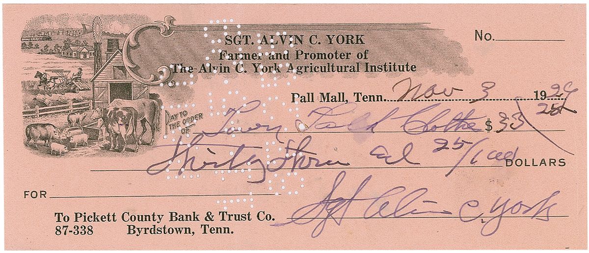 American World War I hero (1887–1964) who won the Medal of Honor for leading a successful charge on a German machine-gun nest that resulted in 32 German deaths and the capture of 132 prisoners. Alvin C. York Agricultural Institute business check, 6.5 x 2.75, filled out and signed by York, payable to Town Talk Clothes for $33.25, November 3, 1929. In fine condition, with cancellation holes to body.