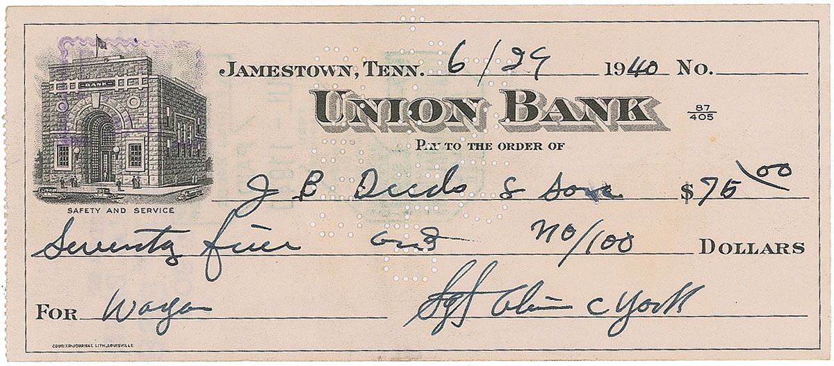 American World War I hero (1887–1964) who won the Medal of Honor for leading a successful charge on a German machine-gun nest that resulted in 28 German deaths and the capture of 132 prisoners. Bank check, 6.25 x 2.75, filled out and signed by York, payable to J. B. Deeds & Sons for $75.00, June 29, 1940. In fine, clean condition, with cancellation holes to body, not affecting clean signature area.