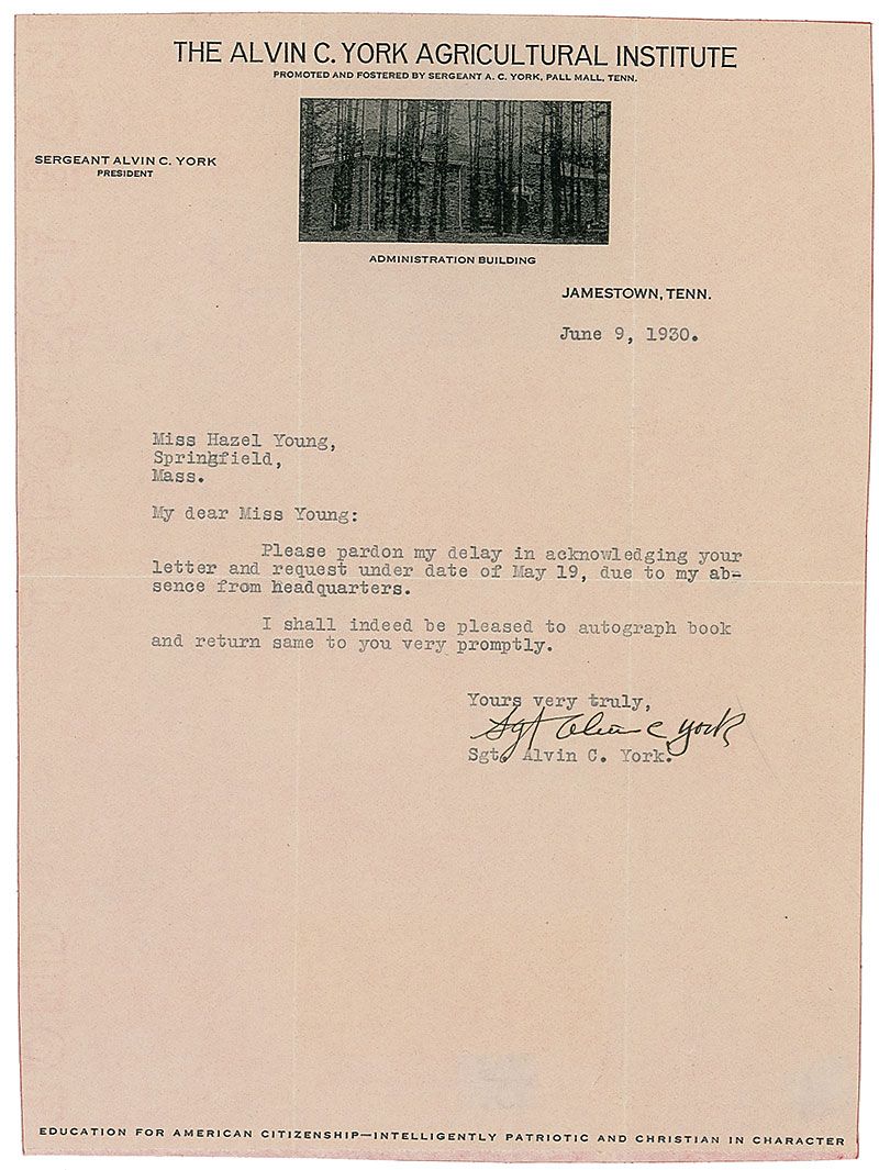 American World War I hero (1887–1964) who received the Medal of Honor for leading a successful charge on a German machine-gun nest that resulted in 28 German deaths and the capture of 132 prisoners. TLS, one page, 7.5 x 10, Alvin C. York Agricultural Institute letterhead, June 9, 1930. Short letter to an admirer. In full: “Please pardon my delay on acknowledging your letter and request under date of May 19, due to my absence from headquarters. I shall indeed be pleased to autograph book and return same to you very promptly.” Letter is affixed to an identical size sheet of cardstock. In fine condition, with intersecting folds, one through a single letter of signature, and trimmed edges.