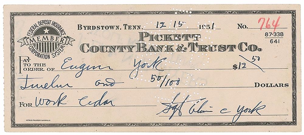 Bank check, 6.25 x 2.75, filled out and signed by York, “Sgt. Alvin C. York,” payable to Eugene York for $12.50, December 15, 1951. In fine condition, with expected cancellation holes (slightly affecting the top of the signature), and a trivial brush to a letter in the memo field.