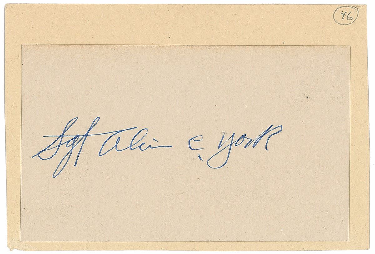 Ink signature, “Sgt. Alvin C. York,” on an off-white 4.75 x 2.75 card affixed to a slightly larger cardstock sheet. In fine condition.