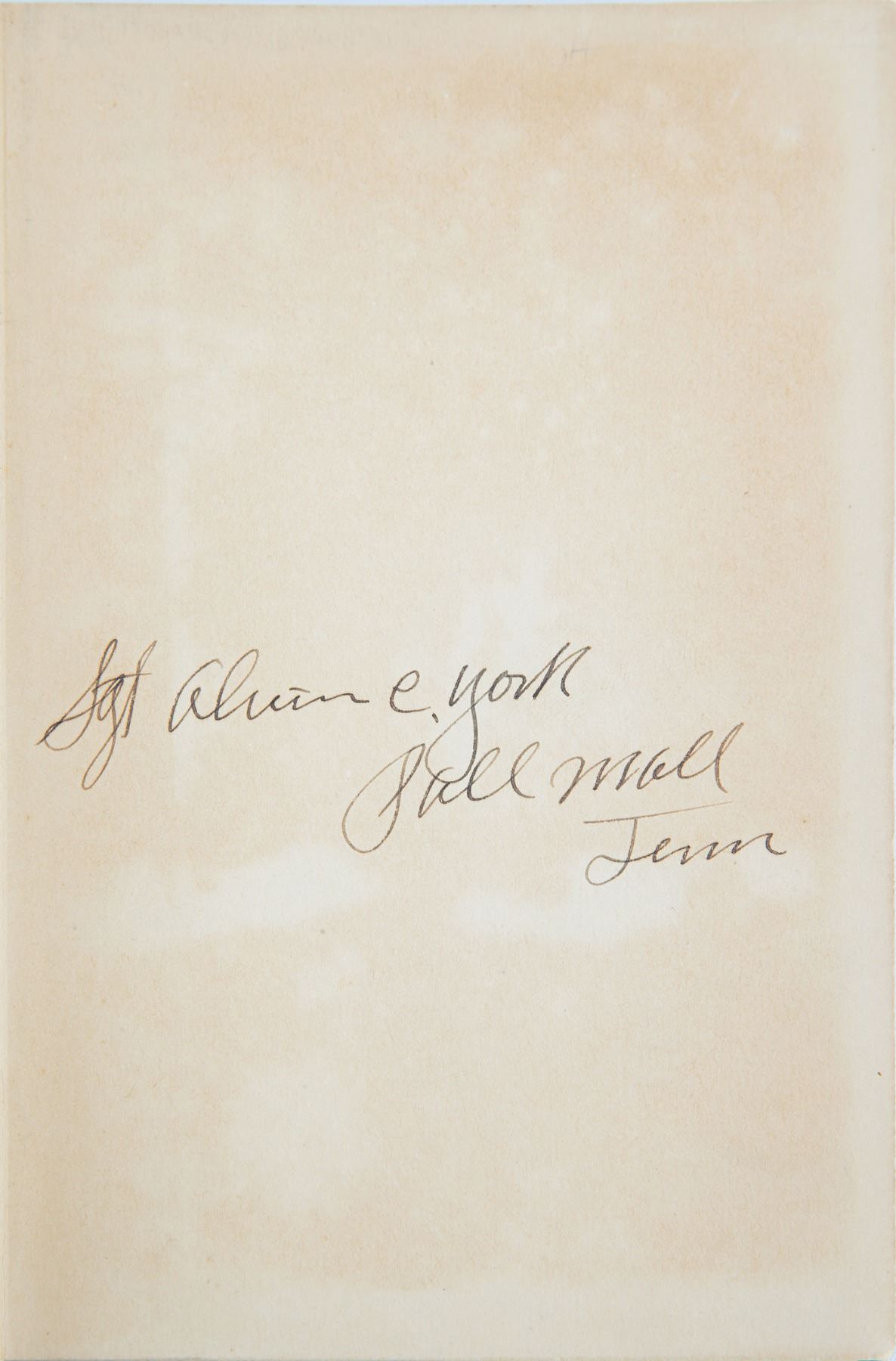Signed book: Sergeant York and His People. First edition. NY: Funk & Wagnalls, 1922. Hardcover, 5.25 x 7.5, 292 pages. Signed on the first free end page in fountain pen, "Sgt. Alvin C. York, Pall Mall, Tenn." In very good to fine condition, with cracking to the hinge, and mottled toning to the signed page.