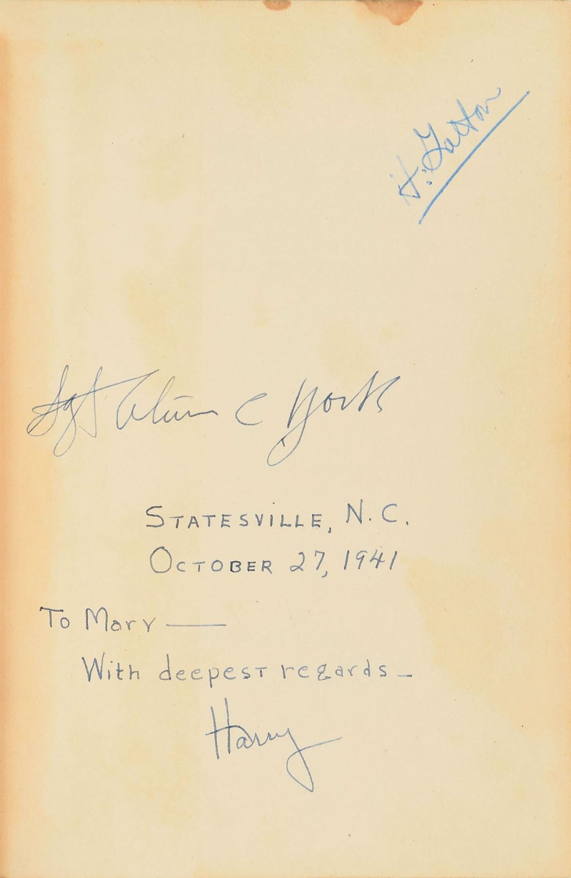 Signed book: Sergeant York and His People. Later printing. NY: Grosset & Dunlap, 1922. Hardcover, 5.75 x 8.25, 292 pages. Signed on the first free end page in fountain pen, "Sgt. Alvin C. York," with a gift inscription and additional signature in another hand. In very good to fine condition, with somewhat irregular toning, and light wear to the covers.