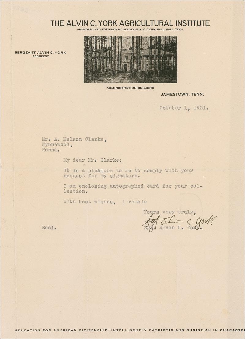 American World War I hero (1887–1964) who won the Medal of Honor for leading a successful charge on a German machine-gun nest that resulted in 32 German deaths and the capture of 132 prisoners. TLS, one page, 8 x 11, The Alvin C. York Agricultural Institute letterhead, October 1, 1931. Short letter complying with a signature request. In part: “It is a pleasure to me to comply with your request for my signature. I am enclosing autographed card for your collection.” In fine condition, with intersecting folds, one through a single letter of signature, and a mild shade of toning. RRAuction COA.