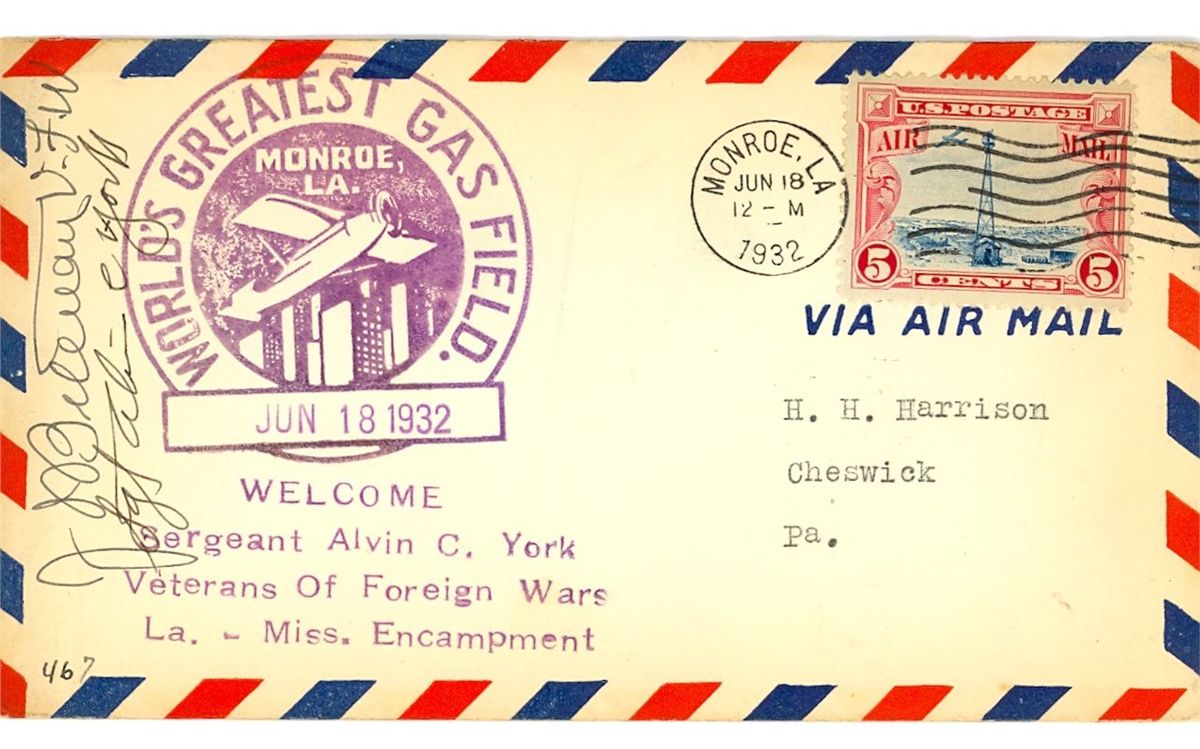 Envelope signed by York, dated June 18th, 1932 Welcoming his visit to Veterans of Foreign Wars, La. Miss. Encampment. Sergeant York, was one of the most decorated American soldiers in World War I. He received the Medal of Honor for leading an attack on a German machine gun nest, taking 32 machine guns, killing 28 German soldiers, and capturing 132 others. .