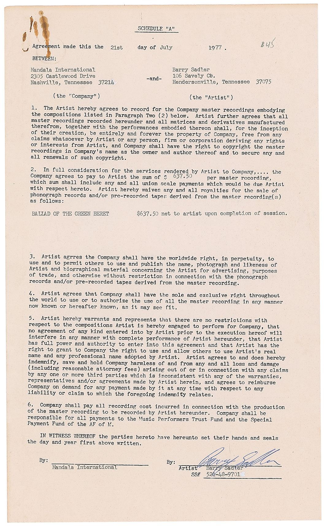 Composer of 'The Ballad of the Green Berets' (1940–1989) who died under mysterious circumstances. DS, signed “Barry Sadler,” one page, 8.5 x 14, July 21, 1977. Agreement between Williams and Mandala International, in which he waives "any and all royalties for the sale of phonograph records and/or pre-recorded tapes derived from the master recording(s) as follows: 'Ballad of the Green Beret,' $637.50 net to artist upon completion of session." In very good to fine condition, with light creasing, and rusty paperclip impressions to the upper left corner. After serving in the Vietnam War from December 1964–May 1965, Sadler returned home and recorded his patriotic 'Ballad of the Green Berets,' which became a number one hit.