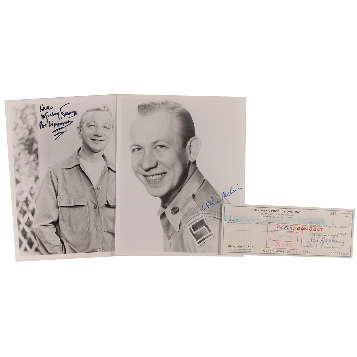 Three items: Gladasya Productions Inc. business check, 8.25 x 3, filled out in type and signed by Phil Silvers, payable to Claude Ellison for $50.00, dated July 26, 1963; a glossy 8 x 10 photo of Allan Melvin, signed in blue felt tip; and a glossy 8 x 10 photo of Mickey Freeman, signed in black felt tip and adding his character name. In fine condition, with a couple light corner creases to signed photos and expected stamps to check, none affecting the signature area. Accompanied by an unsigned photo of Silvers as Sgt. Bilko.
