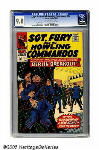 <B>Sgt. Fury and His Howling Commandos #35 (Marvel, 1966) CGC NM/MT 9.8 Off-white to white pages.</B></I> Eric Koenig joins the Howlers in this issue; the group's German member would fight alongside Nick Fury even into the S.H.I.E.L.D. era! Both the cover (with a Hitler appearance) and the interior art are by Dick Ayers. Overstreet 2005 NM- 9.2 value = $40. CGC census 5/05: 1 in 9.8, none higher.