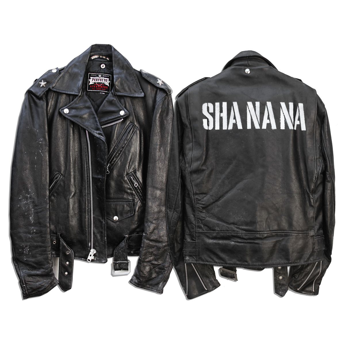 Black leather jacket from the hit 1950's revival band Sha Na Na. Iconic jacket features the band name printed in white across the back, with star-shaped metal studs on the shoulders. Perfecto brand label boasts ''All Hand Cut Steerhide''. Near fine. With a COA from the Gene London Costume Collection.