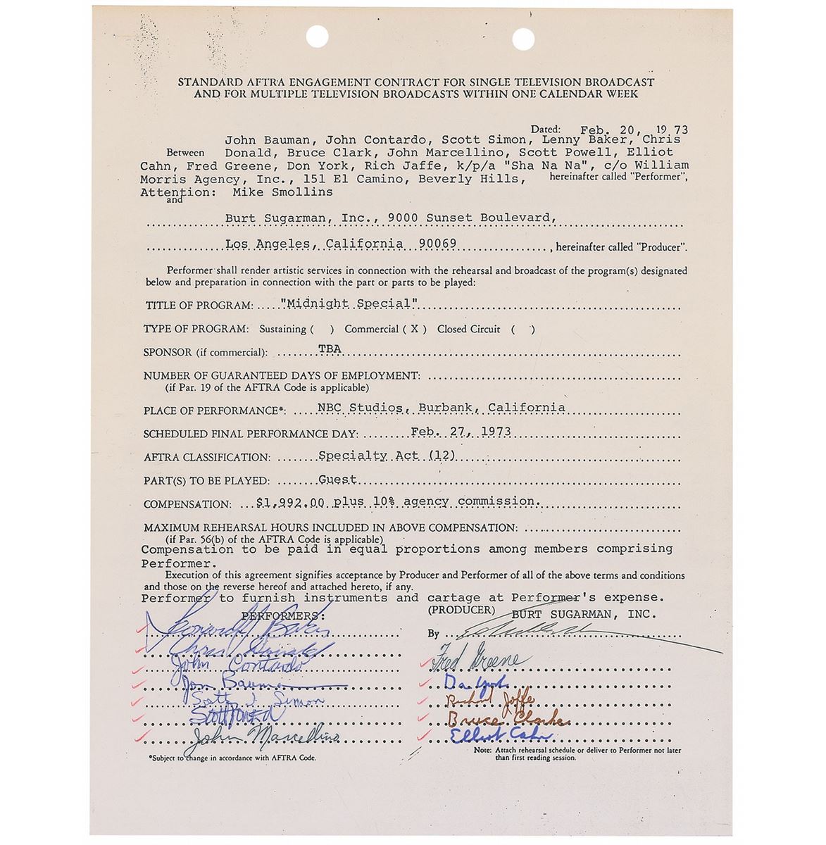 DS, one page, 8.5 x 11, February 20, 1973. Standard AFTRA agreement between the members of Sha Na Na and Burt Sugarman, Inc., for the group to “render artistic services in connection with the rehearsal and broadcast of…‘Midnight Special.’” Signed at the conclusion by many band members using their full names: Lennie Baker, Chris Donald [Vinnie Taylor], Johnny Contardo, Jon Bauman, Scott Simon, Scott Powell, John Marcellino, Fred Greene, Richard Joffe, Don York, Bruce C. Clarke, and Elliot Cahn. Countersigned by Sugarman. In fine condition. Exemplars from this era are virtually nonexistent, and because the band has signed with their legal names our third-party authenticators are unable to render an opinion. However, the Sugarman does match known examples and as this is a legal document we have no reason to doubt the authenticity of the item.