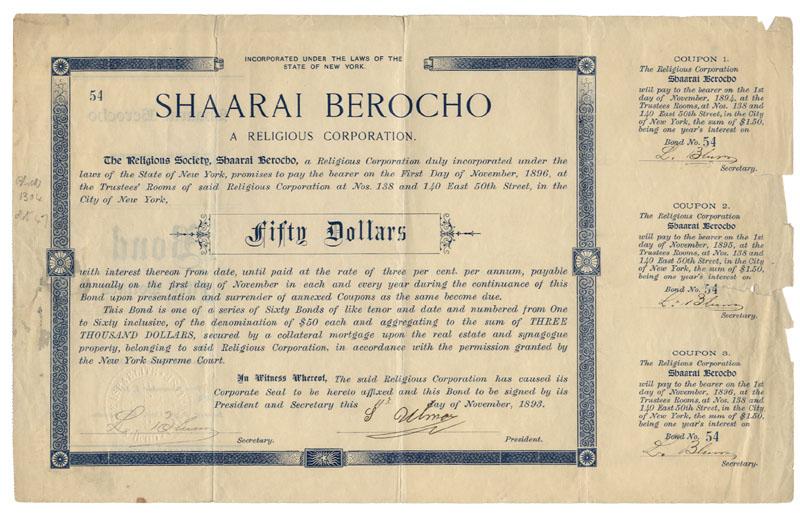 1893. New York. $50 bond bearing 3% interest. Simple document with blue border from this religious corporation. Coupons attached at right. Uncancelled. Folds and archival tape repair. Very Good.