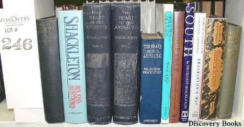 Shackleton, Ernest, by or about. (1). Mill, Hugh Robert. THE LIFE OF SIR ERNEST SHACKLETON. Boston: Little, Brown 1923 First US edition, xv,312pp. Photo plates, text maps. Cloth, spine slightly dull else very good & clean. (2) Huntford, Roland. SHACKLETON. New York: 1986 Third printing. xx,773pp. Illus, maps. Cloth, very good in d/j. (3) Shackleton, Ernest. THE HEART OF THE ANTARCTIC. BEING THE STORY OF THE BRITISH ANTARCTIC EXPEDITION 1907-1909. Philadelphia, 1909 First US edition. 2 vols. 366, 451pp. Plates, maps, missing 1 of 3 folding maps usually found in binding pocket. Original silver decorated cloth, worn, spines dull, repaired, Recased, new endpaper, no binding pocket. Perforated library stamps internally. Reading copy only. (4) Shackleton, Ernest. THE HEART OF THE ANTARCTIC. Another edition, Philadelphia: 1914 xv,368pp. Plates, 4 in color, folding map. Original silver decorated cloth, very good. (5) Hurley, Frank. SHACKLETON'S ARGONAUTS. THE EPIC TALE OF SHACKLETON'S VOYAGE TO THE ANTARCTIC IN 1915. Auckland, 1979. 185pp. Photo illus, endpaper maps. Cloth, fine in d/j. (6) Alexander, Caroline. THE ENDURANCE. SHACKLETON'S LEGENDARY ANTARCTIC EXPEDITION. New York: 1998 211pp. Photo illus, map. Cloth, fine in d/j. (7) King, Peter, editor. SOUTH. THE STORY OF SHACKLETON'S LAST EXPEDITION 1914-1917. North Pomfret, VT: 1992 207pp. Many illus., map. Cloth, fine in d/j. (8) Morrell, Margot & Stephanie Capparell. SHACKLETON'S WAY. LEADERSHIP LESSONS FROM THE GREAT ANTARCTIC EXPLORER. (New York: c.2001) Illus, endpaper maps. Cloth, fine in d/j. (9) (Hurley, Frank). SOUTH WITH ENDURANCE. SHACKLETON'S ANTARCTIC EXPEDITION 1914-1917. THE PHOTOGRAPHS OF FRANK HURLEY. New York: c.2001 Lg., square 4to. 320pp. Many (mostly) photo illus. Cloth, fine in d/j. (10) Fisher, James & Margery. SHACKLETON. (London: 1957) xvi,559pp. Illus., maps. Cloth, very good in d/j. (11) Marr, Scout INTO THE FROZEN SOUTH. London: 1923, first reprint. x,246pp. Photo plates. Original cloth, couple plates loose else very good. (12)