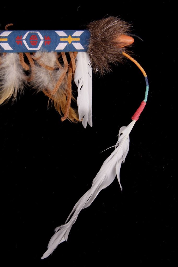 This lot features four Calumet pipes in a shadow box case. The first pipe (circa 1880) is from modern day Oklahoma and is brown with silver bird pieces attached. The pipe also features a nice variation of feathers and different colors of string. Some minor repairs were done to this pipe. The second pipe (circa 1870) is from modern day Iowa and is a light brown wood and red ribbon. The third pipe (circa 1890) is from modern day South Dakota and features a nice dark wood base with a horse head pipe bowl decorated with silver. This pipe also features white, orange, and purple strings accented with white feathers. The fourth pipe (circa 1870) is also from modern day South Dakota and features a designed cloth shell around the pipe that is decorated in blue, yellow, white, and red. The pipes are all in good display condition. The case measures 26” x 18”.