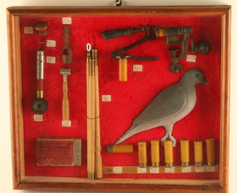 Including Winchester primers, wad cup, wad crimper, primer setter, shotgun cleaning rod, powered and shot dipper, pigeon target. Shadow box measures 21x18"