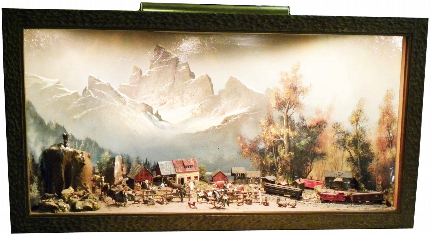 Shadow Box Light Up Farm Display. Depicting a farm scene complete with Rail Car, wagons, old car, barn, house, wild life, cowboys and much more. Very detailed, early construction. Very good condition. 38 1/2 X 20 X 16 1/2 inches.