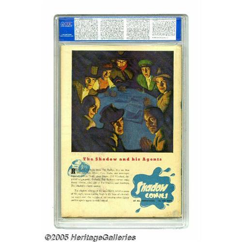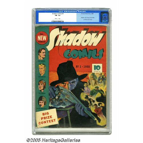 <B>Shadow Comics #1 (Street & Smith, 1940) CGC FN- 5.5 Off-white pages.</B></I> The first comic book appearances of the Shadow and Doc Savage make this issue a milestone. On top of that, it's the very first comic book produced by publisher Street and Smith. In all, some of the most popular fictional characters of the first half of the 20th century fill this comic, with the aforementioned duo joined by Nick Carter, aviator Bill Barnes, and student-athlete Frank Merriwell, making for an unbeatable lineup. Overstreet 2005 FN 6.0 value = $1,356. CGC census 5/05: 1 in 5.5, 4 higher. <BR><BR><B>Important notice:</B> Heritage usually auctions material at the rate of 200-250 lots per hour. On some occasions eBay Live bid software or the Internet may not be able to keep up with the pace of the auction. We recommend placing a realistic absentee bid now as insurance to avoid disappointment. Occasionally the auctioneer may eliminate or reject an eBay Live bid, and the auctioneer may also reopen a lot after the close of the eBay live bidding (usually because we missed an audience bid), and may reject your bid even if it shows you as the winning bidder. By bidding via eBay Live, you agree that Heritage may award the lot to another bidder at its sole discretion under the circumstances described above or any other reasonable circumstances. Since eBay bids are not shown to us until we open the lot on the floor, we treat those bids just like floor bids. In most cases the floor responds before the eBay bid is presented to us, due to Internet lag time, so for consistency we have made it a policy that floor bids are always considered first over tie eBay live bids. Also please note that all Heritage lots purchased through eBay Live carry a 20% Buyer's Premium. Please make sure you read the Terms and Conditions before you bid. This lot is being auctioned in conjunction with a live floor auction by Heritage Galleries & Auctioneers. All final auction and invoice information will be supplied