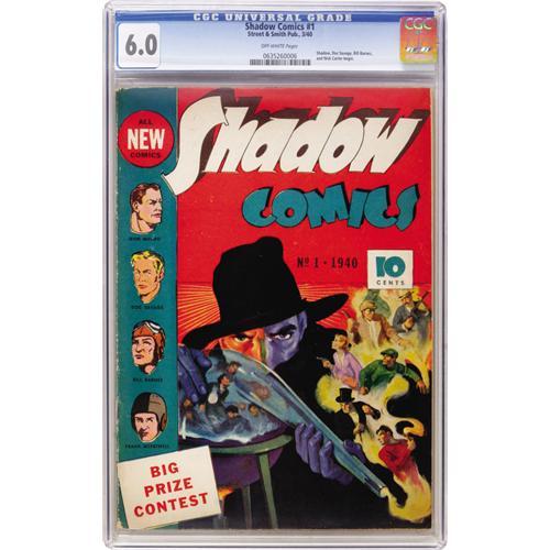 <B>Shadow Comics #1 (Street & Smith, 1940) CGC FN 6.0 Off-white pages.</B></I> Both the Shadow <I>and</B></I> Doc Savage made their first comic book appearances here, it doesn't get much bigger than that! It's also the first comic put out by pulp heavyweight Street and Smith, and the other characters were also hits in other media -- Nick Carter, aviator Bill Barnes, and student-athlete Frank Merriwell are all found in these pages. Overstreet 2006 FN 6.0 value = $1,365. CGC census 3/07: 1 in 6.0, 4 higher.<BR><BR><b>Shipping:</b> Comics - Slabbed (certified) (<a target="_blank" href="http://www.heritageauctions.com/common/shipping.php">view shipping information</a>)