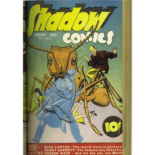 <B>Shadow Comics Softcover Bound Volume (Street & Smith, 1941-42).</B></I> We suspect that a publisher or artist had this unusual softcover volume made. It's got a green paper cover, date-stamped "Sep 5 1956" on the inside, and the issue numbers are handwritten on the spine (incorrect numbers, however). This would be the ideal candidate to have re-bound into a hardcover, a fairly inexpensive process. Included here are trimmed and bound copies of V1#10, V1#12, V2#1, V2#2, V2#3, V2#5, and V2#7. In addition to the Shadow, these comics have appearances by the Dead End Kids, Little Nemo, and Supersnipe (V2#3 is the latter's first appearance!). Note that this series can be confusing since the wrong numbers are in the indicia, Gerber doesn't help by picturing the wrong V2#2, and these issues are bound out of order! The important thing is the condition, though, and these copies have the fresh cover colors we've come to expect from bound volumes. Overstreet 2006 VG 4.0 value for group = $1,300.<BR><BR><b>Shipping:</b> Books & Catalogs (<a target="_blank" href="http://www.heritageauctions.com/common/shipping.php">view shipping information</a>)