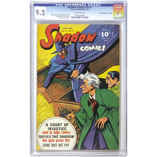 <B>Shadow Comics V6#3 Davis Crippen ("D" Copy) pedigree (Street & Smith, 1946) CGC NM- 9.2 Off-white pages.</B></I> It's amazing considering the Shadow's popularity but it's true: this is the only copy of this issue that CGC has certified to date. Overstreet 2006 NM- 9.2 value = $475. CGC census 9/06: 1 in 9.2, none higher. <I>From the Crippen Collection</B></I>.<BR><BR><b>Shipping:</b> Slabbed Comic (<a target="_blank" href="http://www.heritageauctions.com/common/shipping.php">view shipping information</a>)