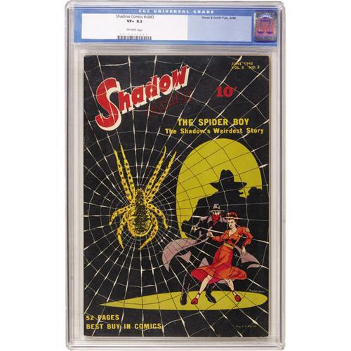 <B>Shadow Comics V8#3 (Street & Smith, 1948) CGC VF+ 8.5 Off-white pages.</B></I> Doc Savage backup story. Bob Powell cover and art. Classic spider web cover. Overstreet 2006 VF 8.0 value = $281; VF/NM 9.0 value = $441. CGC census 3/07: 2 in 8.5, none higher.<BR><BR><b>Shipping:</b> Comics - Slabbed (certified) (<a target=""_blank"" href=""http://www.heritageauctions.com/common/shipping.php"">view shipping information</a>)