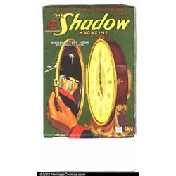 Shadow June 1, 1935 (Street & Smith, 1935). This is a spectacular example of a mid-Thirties Shadow pulp with a classic Rozen cover. This well-preserved copy has superb colors and while the page are a supple cream to off-white pages -- highly desirable to even the most finicky collector. There is a small piece of gum stuck to the front cover, some minor color flaking, and a chip out at the bottom of the front cover. Overall this copy is a VG/FN. These early Shadow pulps with a classic cover and high-quality pages are very desirable and hard-to-find. Important notice: We expect to be auctioning lots at the rate of 200-250 per hour. Sometimes eBay Premier live bid software cannot keep up with that pace, so we strongly recommend that you place a realistic proxy bid now as insurance to avoid disappointment. Also please note that all Heritage/CAA lots purchased through eBay Premier carry a 20% Buyer's Premium. Please make sure you read the Terms and Conditions.