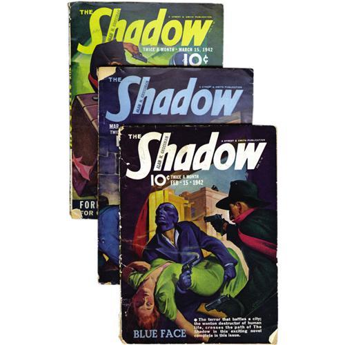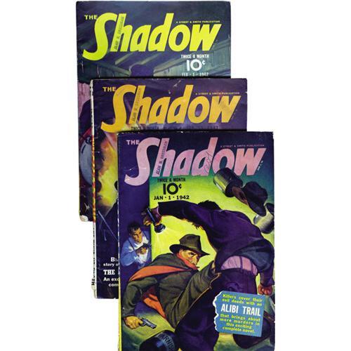 <B>Shadow (Pulp) Group (Street & Smith, 1942) Condition: Average GD/VG.</B></I> Here is a complete run of bi-monthly <B>Shadow</B></I> pulps for the year of 1942. Highlights include gripping tales, and some classic cover art. Most have nice paper quality. Bookery's Guide to Pulps approximate value for group = $825. <BR><BR><B>Important notice:</B> Heritage usually auctions material at the rate of 200-250 lots per hour. On some occasions eBay Live bid software or the Internet may not be able to keep up with the pace of the auction. We recommend placing a realistic absentee bid now as insurance to avoid disappointment. Occasionally the auctioneer may eliminate or reject an eBay Live bid, and the auctioneer may also reopen a lot after the close of the eBay live bidding (usually because we missed an audience bid), and may reject your bid even if it shows you as the winning bidder. By bidding via eBay Live, you agree that Heritage may award the lot to another bidder at its sole discretion under the circumstances described above or any other reasonable circumstances. Since eBay bids are not shown to us until we open the lot on the floor, we treat those bids just like floor bids. In most cases the floor responds before the eBay bid is presented to us, due to Internet lag time, so for consistency we have made it a policy that floor bids are always considered first over tie eBay live bids. Also please note that all Heritage lots purchased through eBay Live carry a 22.5% Buyer's Premium. Please make sure you read the Terms and Conditions before you bid. This lot is being auctioned in conjunction with a live floor auction by Heritage Auction Galleries. All final auction and invoice information will be supplied by Heritage Auction Galleries, and all other information should be considered preliminary. Lot:41001 <BR><BR><B>Winning Notification and Billing:</B> After the FINAL session in this auction is complete, Heritage will send e-mail and snail mail invoices. This process normally takes several days. All final auction and invoice information will be supplied by Heritage Auction Galleries, and all other information should be considered preliminary. <BR><BR>This auction will be conducted on a live auction floor and over the Internet through eBay Live. If you choose to place an absentee bid, please take a moment to <font color='#0000ff'><u><a href='http://pages.ebay.com/liveauctions/help/before/laabsentee.html'>learn how eBay Live absentee bidding works</a></u></font><font color='#000000'>