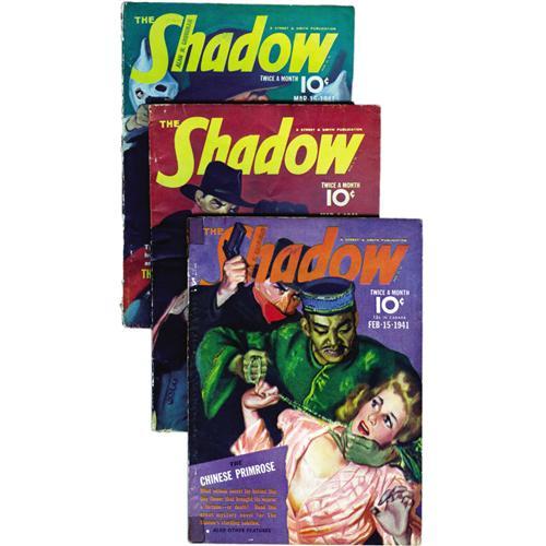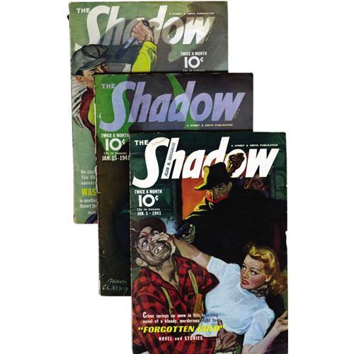 <B>Shadow (Pulp) Group (Street & Smith, 1941) Condition: Average VG.</B></I> This lot consists of a complete run of bi-monthly <B>Shadow</B></I> pulps for the year of 1941. Highlights include the 10th anniversary issue, and first pulp appearance of Margo Lane. Most have very nice paper quality. Bookery's Guide to Pulps VG value for group = $1,215. <BR><BR><B>Important notice:</B> Heritage usually auctions material at the rate of 200-250 lots per hour. On some occasions eBay Live bid software or the Internet may not be able to keep up with the pace of the auction. We recommend placing a realistic absentee bid now as insurance to avoid disappointment. Occasionally the auctioneer may eliminate or reject an eBay Live bid, and the auctioneer may also reopen a lot after the close of the eBay live bidding (usually because we missed an audience bid), and may reject your bid even if it shows you as the winning bidder. By bidding via eBay Live, you agree that Heritage may award the lot to another bidder at its sole discretion under the circumstances described above or any other reasonable circumstances. Since eBay bids are not shown to us until we open the lot on the floor, we treat those bids just like floor bids. In most cases the floor responds before the eBay bid is presented to us, due to Internet lag time, so for consistency we have made it a policy that floor bids are always considered first over tie eBay live bids. Also please note that all Heritage lots purchased through eBay Live carry a 22.5% Buyer's Premium. Please make sure you read the Terms and Conditions before you bid. This lot is being auctioned in conjunction with a live floor auction by Heritage Auction Galleries. All final auction and invoice information will be supplied by Heritage Auction Galleries, and all other information should be considered preliminary. Lot:41001 <BR><BR><B>Winning Notification and Billing:</B> After the FINAL session in this auction is complete, Heritage will send e-mail and snail mail invoices. This process normally takes several days. All final auction and invoice information will be supplied by Heritage Auction Galleries, and all other information should be considered preliminary. <BR><BR>This auction will be conducted on a live auction floor and over the Internet through eBay Live. If you choose to place an absentee bid, please take a moment to <font color='#0000ff'><u><a href='http://pages.ebay.com/liveauctions/help/before/laabsentee.html'>learn how eBay Live absentee bidding works</a></u></font><font color='#000000'>