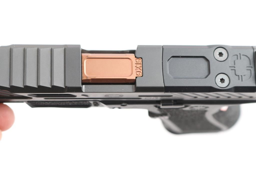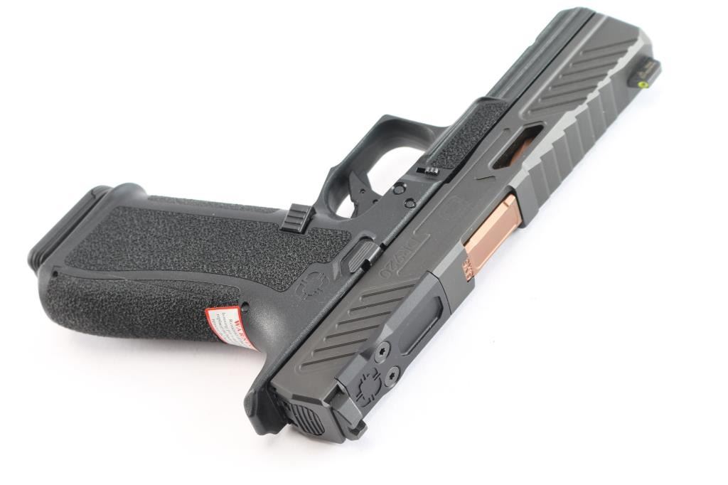The 'Elite,' a high quality American made Glock compatible full-size striker fired pistol chambered for 9x19mm. Manufactured in Plano, TX. Over the standard G17 Glock, this pistol incorporates many desirable custom features directly from the factory. Pistol features a matte black nitride finish, bronze 4.5" fluted barrel, Ameriglo tritium front sight with a bright yellow outline, serrated square notched rear sights, front and rear slide cocking serrations, ported slide, full-length metal guide rod with a flat recoil spring, smooth semi-flat faced trigger with integral blade safety, undercut trigger guard with stippled front, serrated push-button mag release, optics cut slide with removable plate installed, accessory rail on dust cover, replaceable back straps, and a black stippled slim contoured polymer frame. The original black nitride finish retained is approximately 99% with nothing remarkable. Metal displays no rust or deformation. Bore is bright with strong rifling, and the action smooth and crisp. The polymer frame is also excellent. Pistol includes soft case, two Magpul seventeen-round magazines, two extra back straps, lock, manual, sticker, tool, oil, Locktite, extra hardware, and factory cardboard box.