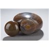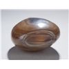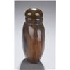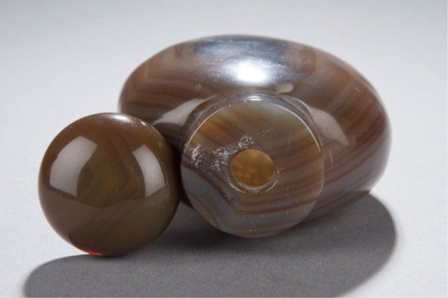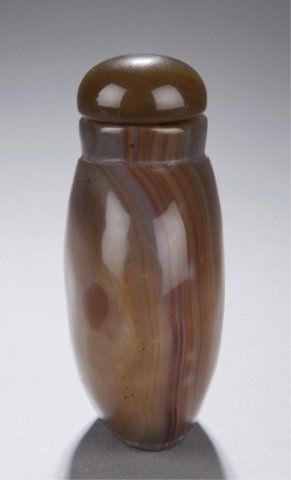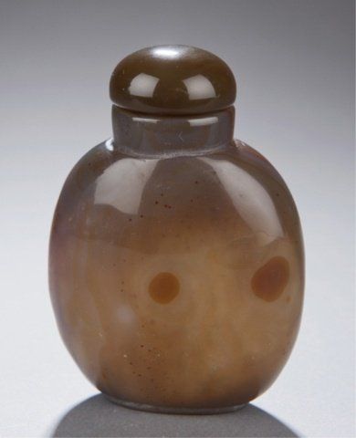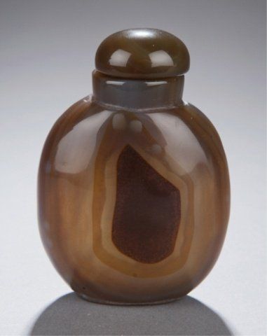 A shadow agate snuff bottle. Late 19th/early 20th century. Of flattened round shape sitting on a raised oval foot. The stone of light to dark brown, large natural inclusion of dark brown on front. Well hollowed, with agate top and ivory spoon. 3"h.