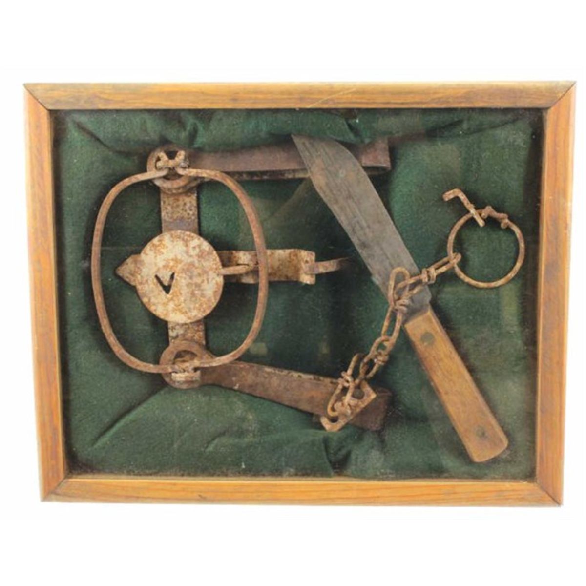Shadow box antique trap and hunting knife framed size 12" X 15".