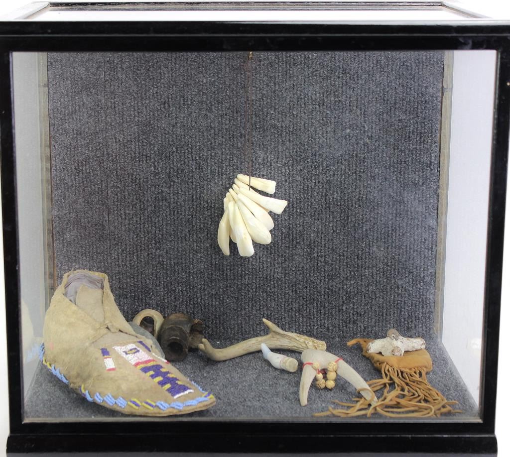 Shadow box collection includes 1890's Northern Plains single moccasin, 11" X 15" X 17" . Northern Plains single moccasin, 11" X 15" X 17" .