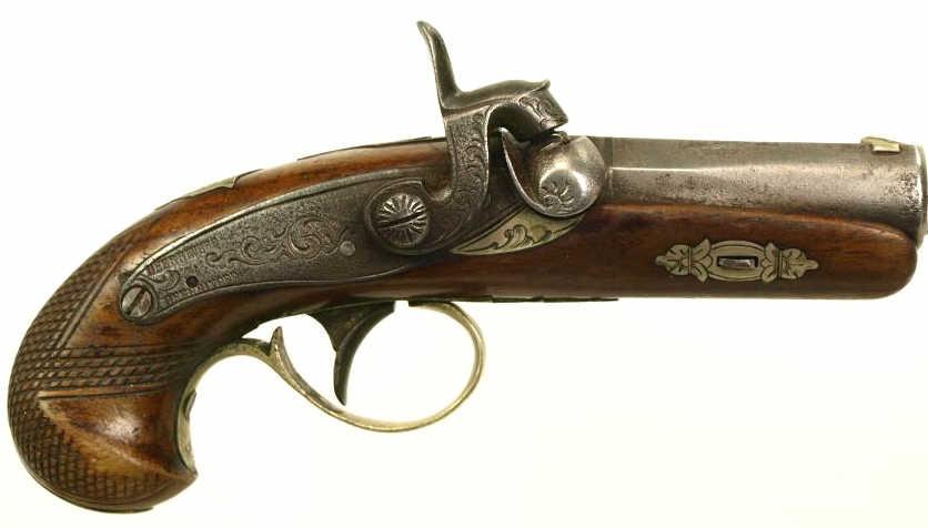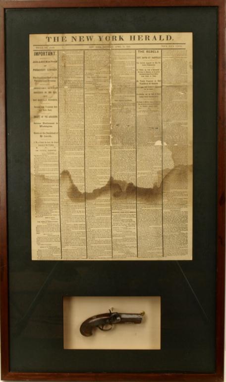 April 15 1865 newspaper with period percussion Derringer, very good overall condition, metal surfaces with silvery gray patina engraved and stamped Derringer to lock plate and top of barrel, good checkered walnut stock and nice action. Great office, library or gun room display, framed 21" X 35".