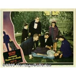<B>Shadow of a Doubt (Universal, 1943).</B></I> Lobby Cards (2) (11" X 14"). One of Hitchcock's most absorbing films tells the tale of the mysterious Uncle Charlie (Joseph Cotten) who comes to stay with his niece (Teresa Wright) and her family in their small California town. Certain events begin to take place that leads the young Wright to believe her uncle may be the "Merry Widow" serial killer. Offered in this lot are two cards that highlight such scenes. The first shows Wright as she discovers an article that has been suspiciously clipped from the paper. Other than trivial imperfections, the card is pristine. Near Mint. The second card shows a prostrate Wright who becomes suddenly stricken when she finds out the truth about Uncle Charles. There is one light scratch across Cotton and a border stain along the upper left border. Very Fine. 2 items